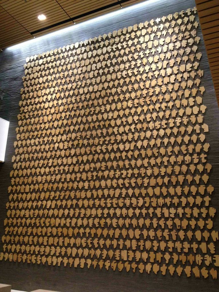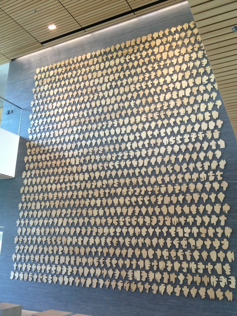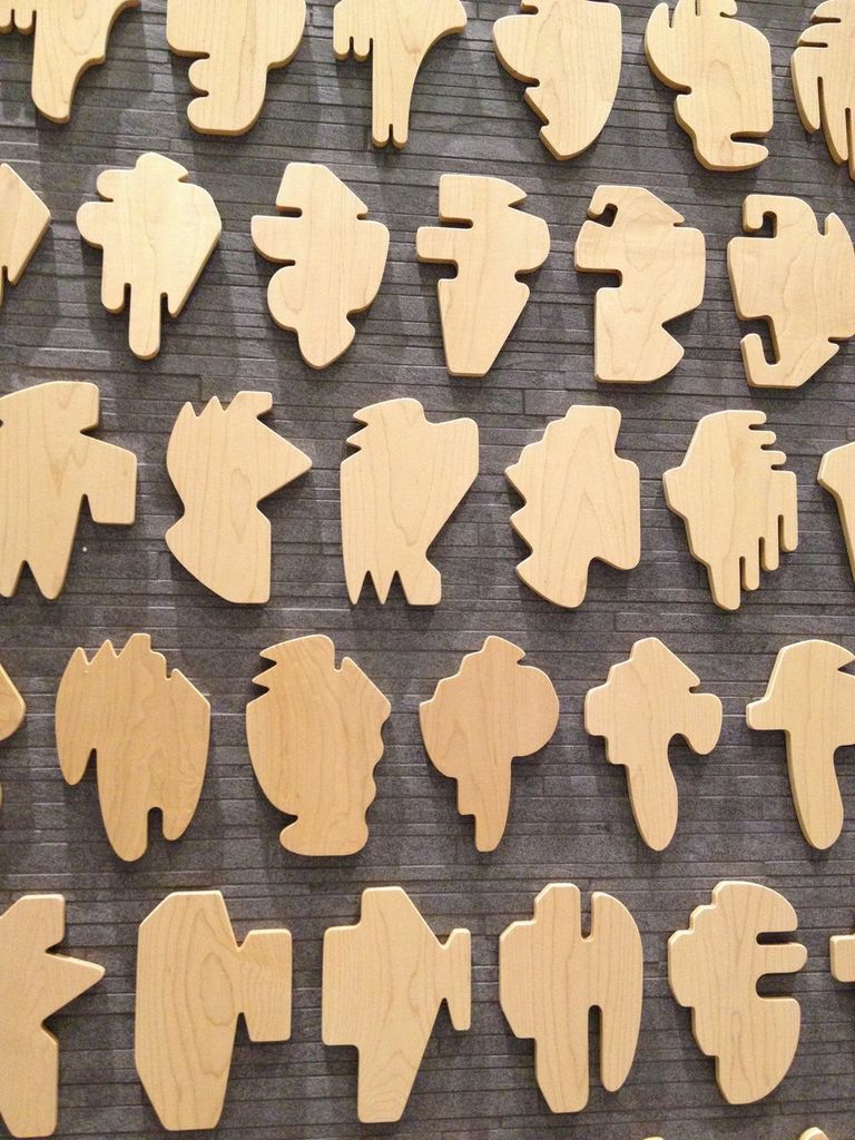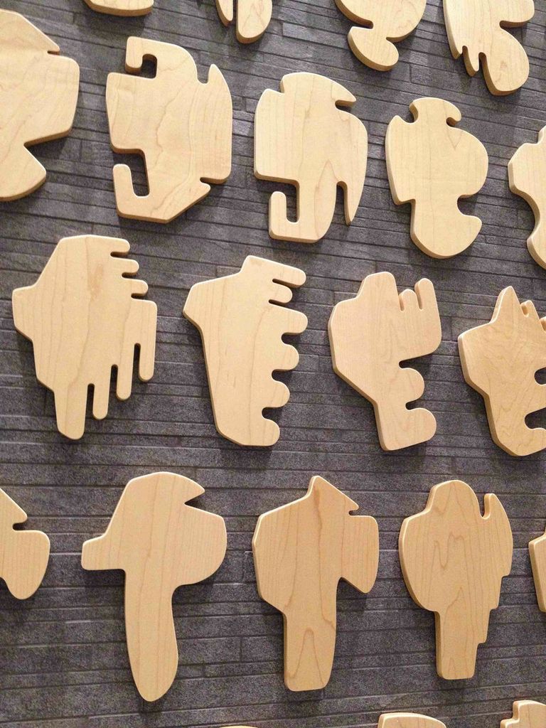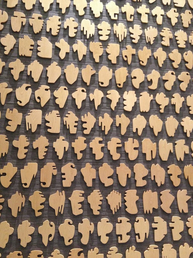 For the Shapes Project installed at the Smith Cardiovascular Research Building, McCollum presents a set of wooden objects that represent the possibility of creating a unique and distinctive shape to represent each person on the planet: “I was interested in how people identify themselves as part of a group, and how often that depends on looking up to someone or some "thing." They follow leaders, are governed or represented by a king or a president. I was playing with the idea that a single symbol (a corporate logo, a flag, or a coat of arms) might have meaning for thousands, even millions, of people, but also thinking about how these structures can become autocratic. It was an experiment, and my solution was to imagine a heraldic symbol for every person on the planet…When I was thinking about how many to make, I learned that the United Nations estimates that there will be 9.5 billion people on the planet in 2050. That would be the peak, and then the numbers would begin to decrease.