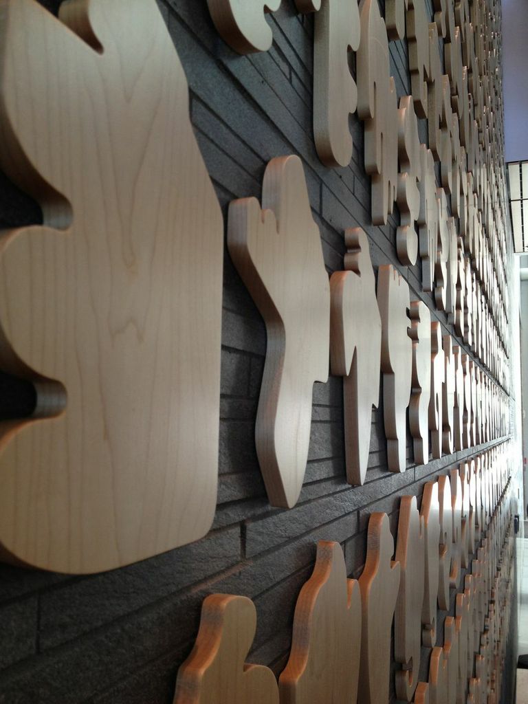 This graphic inquiry into the relationship between sameness and multiplicity is especially relevant to a life science research facility. We might think of these shapes as representing individual humans, individual thoughts and ideas, or even single cells in the body. The collection and all its possible variations can stand in for humankind, then, or for scientific systems, or lab equipment, or for any set of component parts where deviation, variation, and innovation come into play. McCollum has realized the project in conjunction with various collaborators and fabricators in a variety of forms, from larger sculptures to monoprints, copper cookie cutters and rubber stamps. Woodworkers Horace and Noella Varnum fabricated each of the wooden pieces for the Shapes project, and Atthowe Fine Art Services installed this set at the Smith Cardiovascular Research Building.