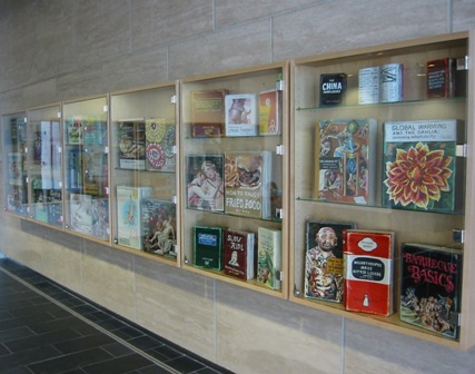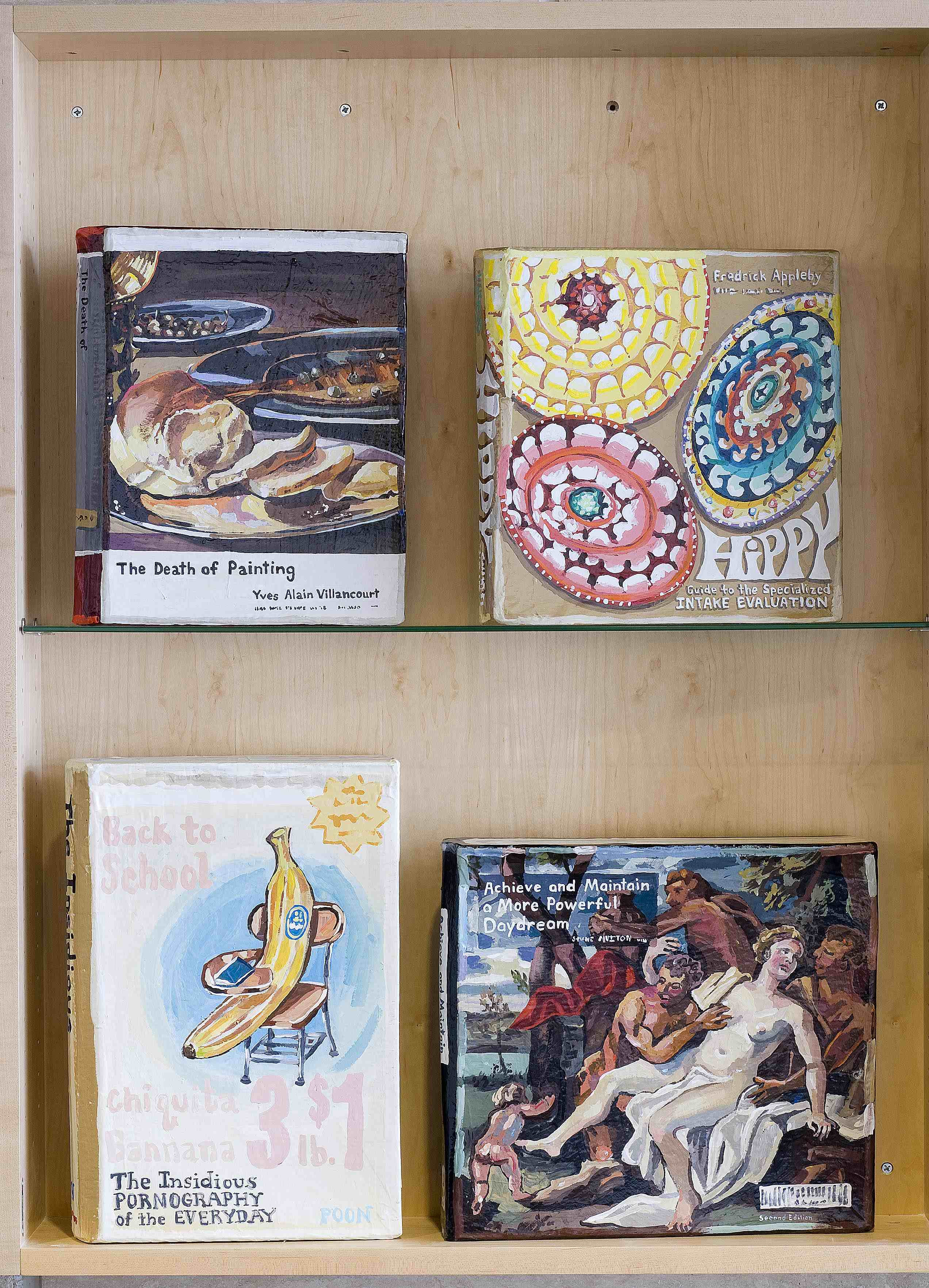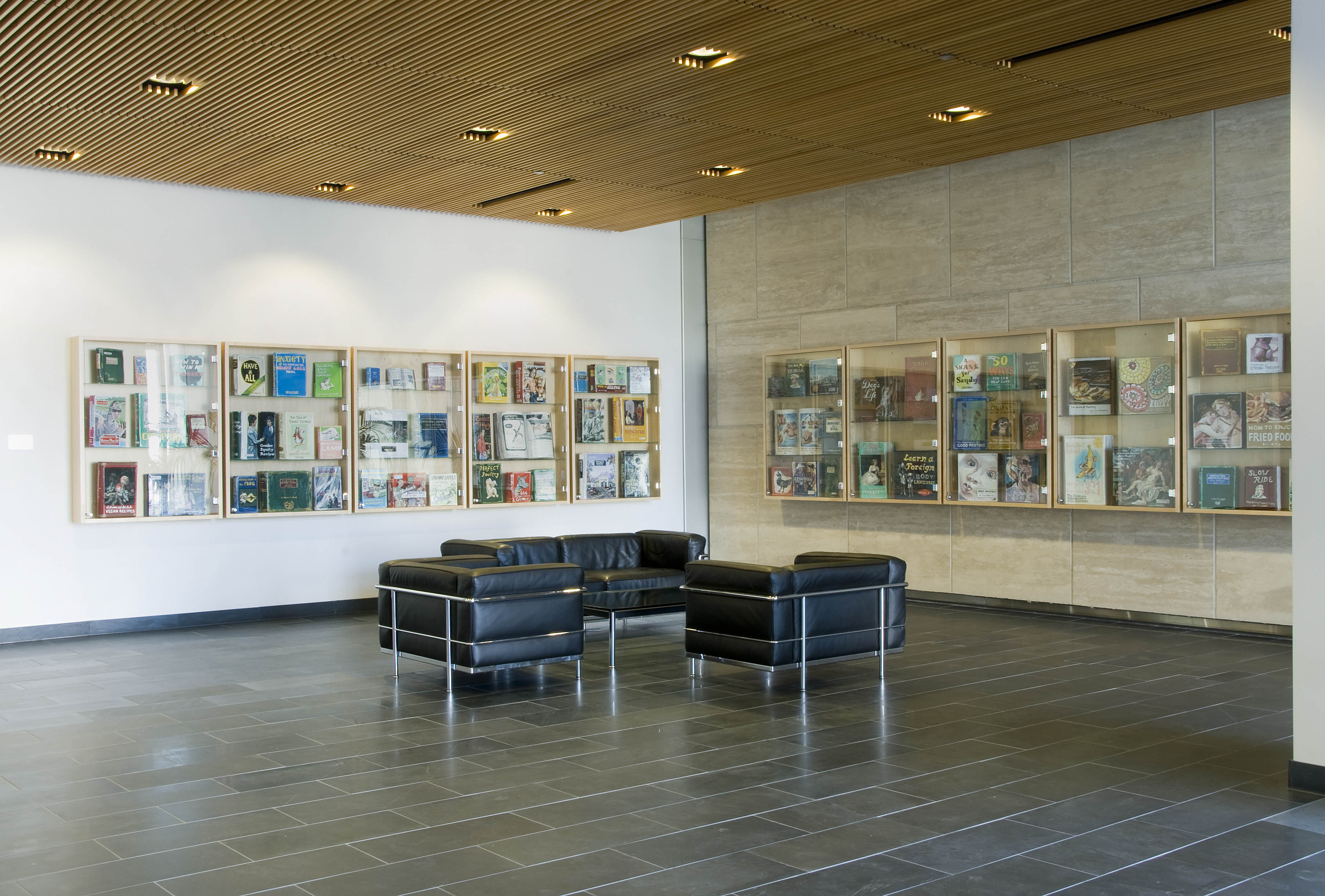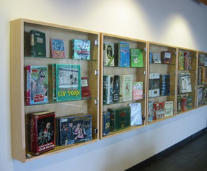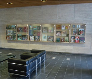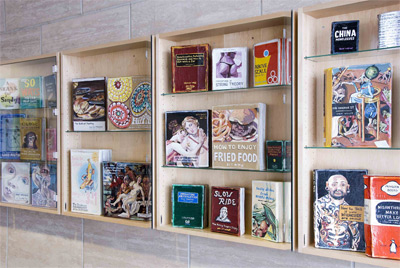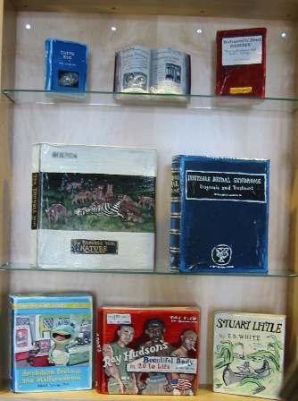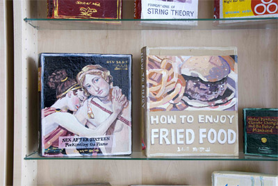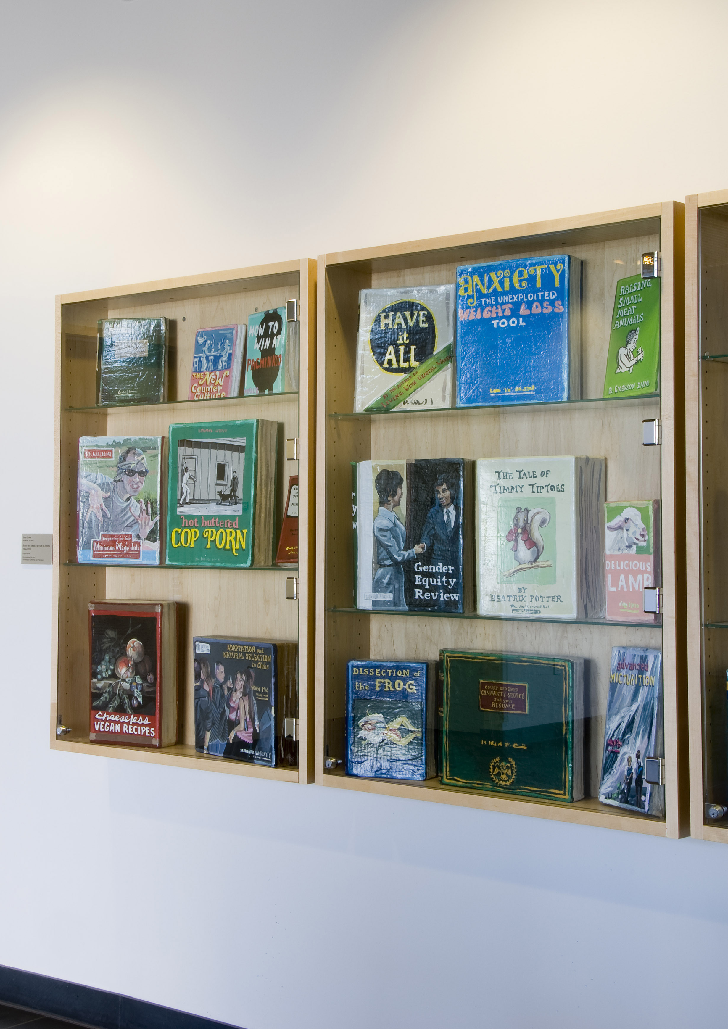 Byers Hall, like the other buildings at Mission Bay, has several internal lobbies designed to promote interaction between scientists, and these were fitted with display cabinets. Lowe re-configured these cabinets to create a more open space, and she outfitted them with more than 90 original, painted books covering all manner of actual, invented and subverted subjects, ranging from "The Death of Painting" to "Premature Articulation" to "String Theory." These straightforward and engaging painterly objects can be understood in many different ways when compared to each other and to the group as a whole.