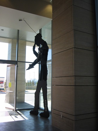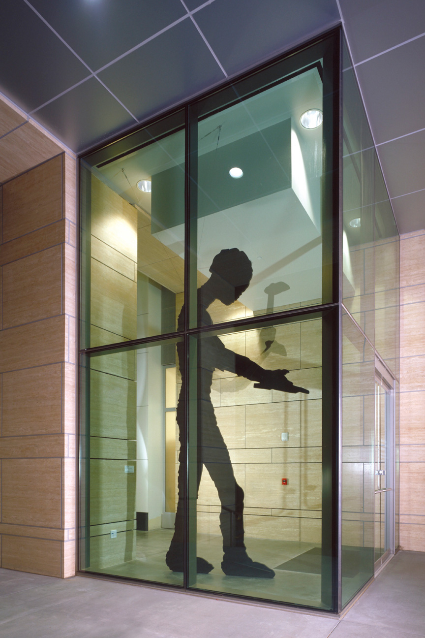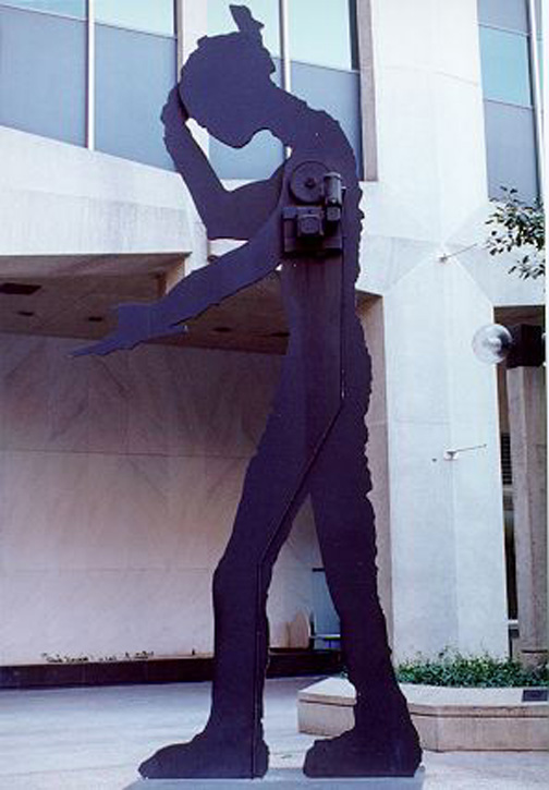 His 1984 work, titled Hammering Man at 2,908,440, is on loan to UCSF from the San Francisco Museum of Modern Art, and was installed in July 2005 in the main entry to Byers Hall, housing the California Institute for Quantitative Biomedical research (QB3). One of Borofsky's best-known images, Hammering Man expresses his respect for work and repetition. The repetitive motion of this kinetic sculpture and its prominent identifying number echo the fusion of math and biology being explored by QB3.