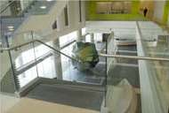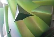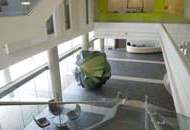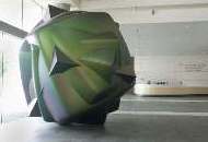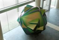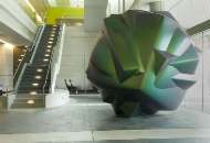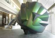 Her work at UCSF, "Untitled 2001," is installed in the lobby of the Diller Family Cancer Research Building, visible from multiple viewpoints throughout the multilevel atrium as well as to walkers, drivers and Muni riders along 3rd Street. Made of fiberglass, paint and steel, "2001" is a 12-foot-diameter form generated using animation software to represent six equal steps in a progression from a sphere to a cube, superimposed upon each other. The resulting object, precisely fabricated in epoxy resin, is complex and asymmetrical, and its appearance changes constantly as one moves around it because of the unique refractive properties of the "Harlequin" paint surface - which flips from green to magenta. A form generated from mathematics becomes asymmetrical, and frames perception as an individual, biological function.