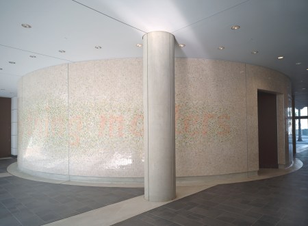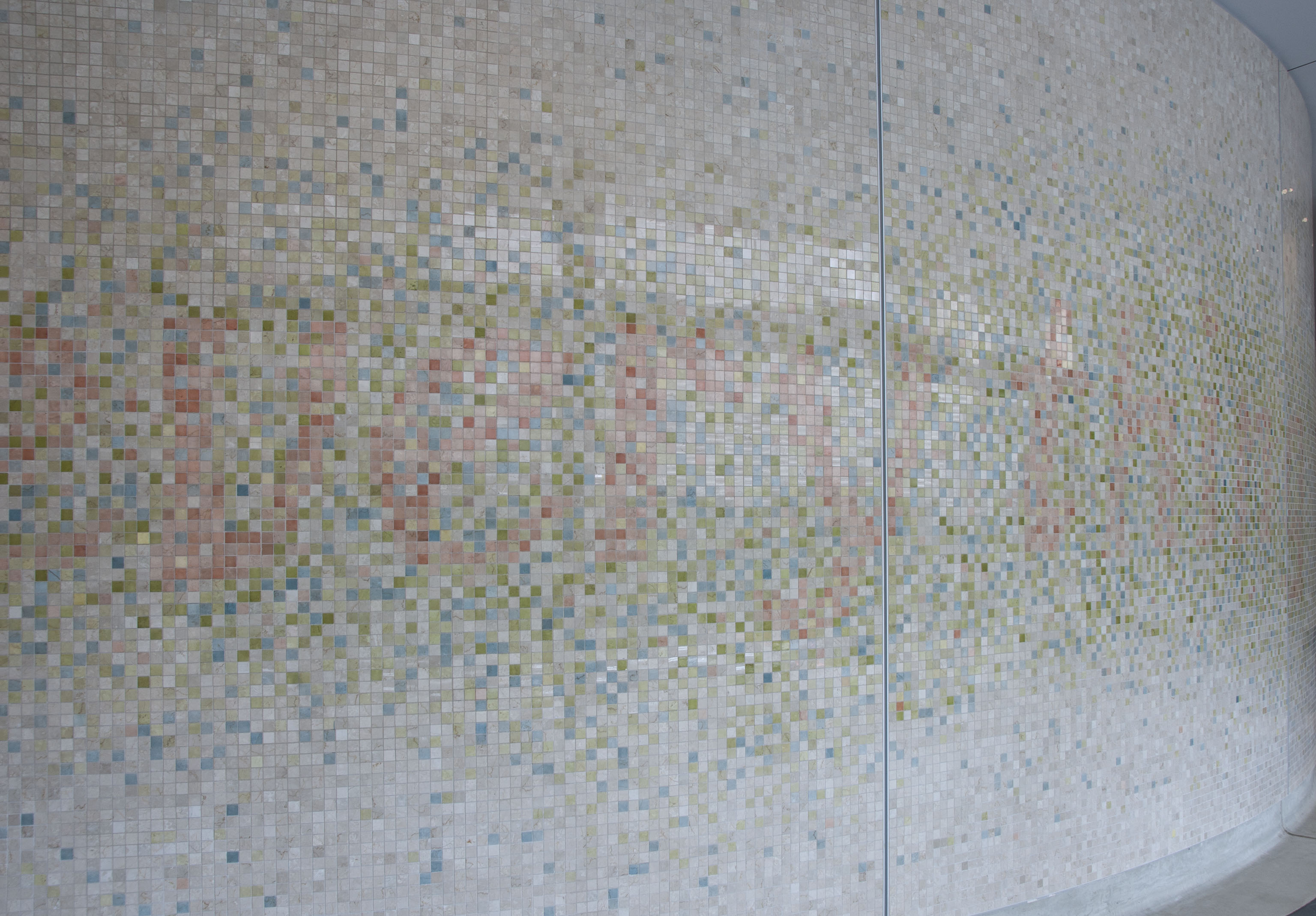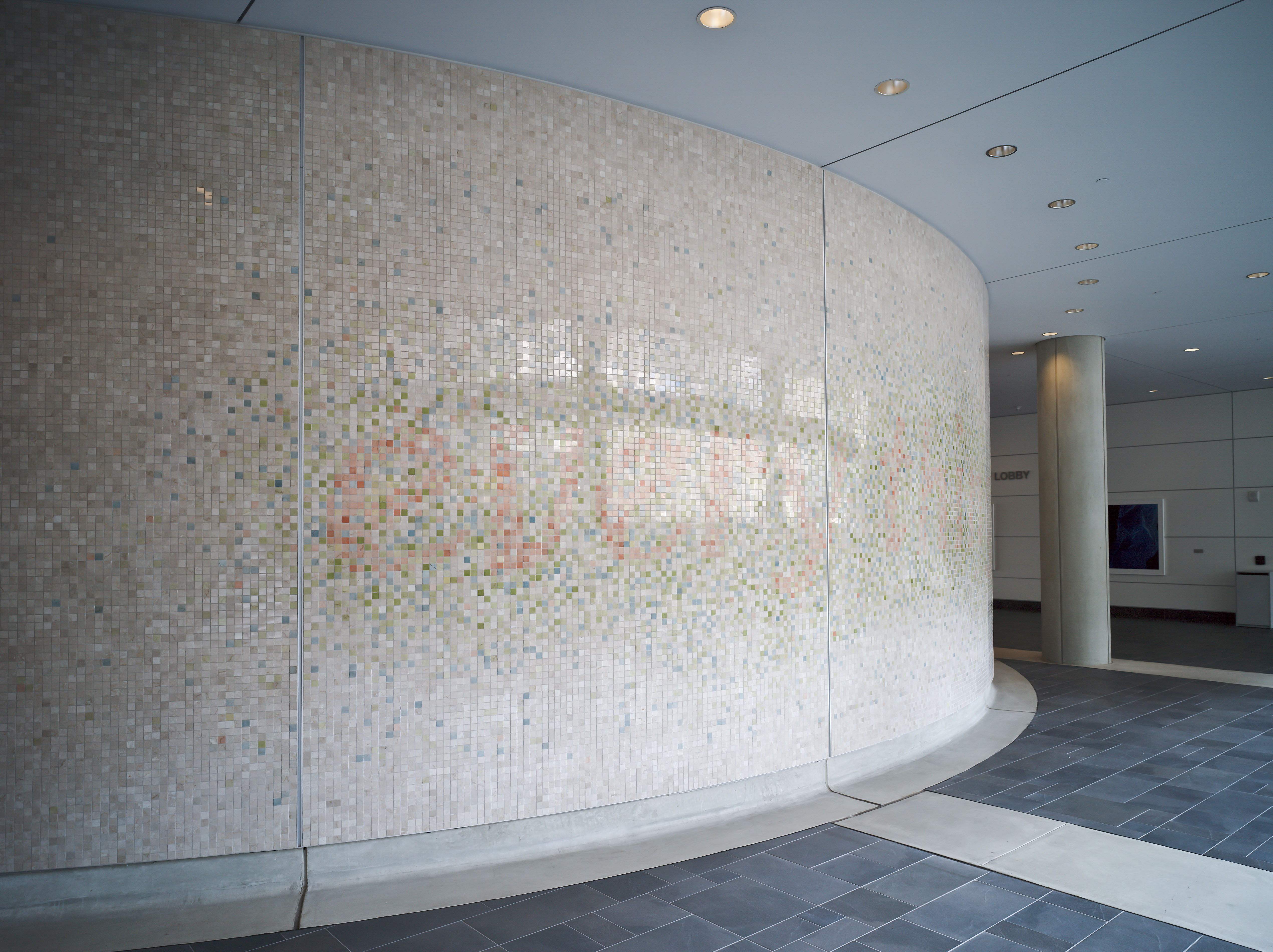 In his father’s medical library, Paul Kos found a book containing the color vision charts developed by Japanese ophthalmologist Shinobu Ishihara in in 1918. Even today, these intricate watercolor charts remain in use throughout the world. Bringing together as if by accident two completely disparate things, Kos adapted these classic vision tests to the phrase every thing matters, attributed to Vaclav Havel, then President of Czechoslovakia. He created a small watercolor drawing. Then, years later, on entering the lobby of the newly completed Diller Cancer Research Building, he saw the polished, reflective limestone mosaic wall, curving through the space and reflecting what would eventually be a garden outside. The idea of these color vision tests came back in a completely different form and material.
