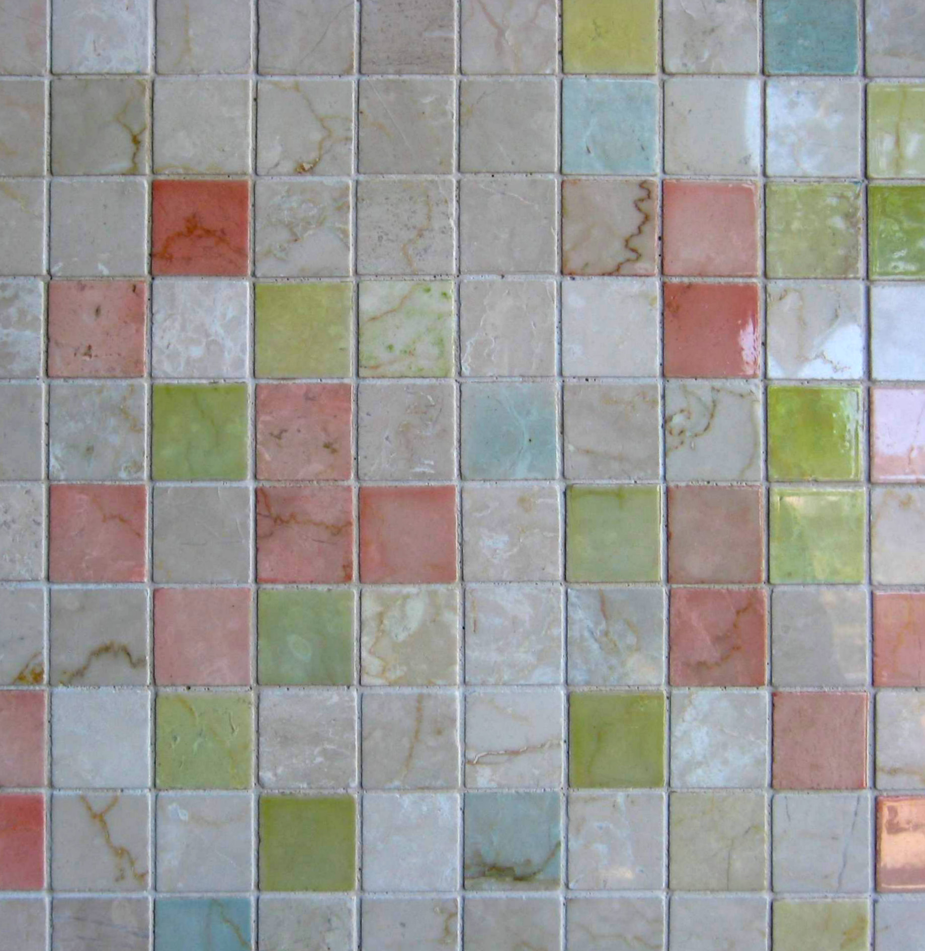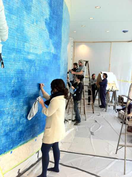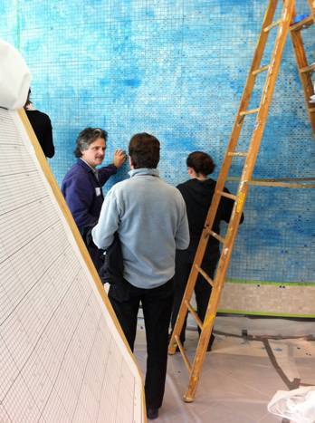 Transforming the existing tiles into a range of 12 different shades and complementary hues, while maintaining their reflectivity (so that the garden outside could eventually be drawn in as part of the image) was no simple task. Working with the San Francisco specialty paint company Underground Colors, Kos experimented with different solutions that would allow the natural veining of the limestone to remain visible, so that the stone itself could be magically and subtlely changed. Ultimately these specialists transformed some 20,000 tiles according to an elaborate plan. The result is an intricate yet subtle array that is experienced as a multitude of individual, separate parts, as a series of abstract vignettes, and ultimately comes together as both image and language in a cohesive and useful whole.