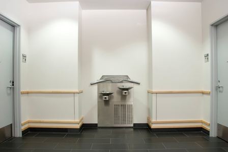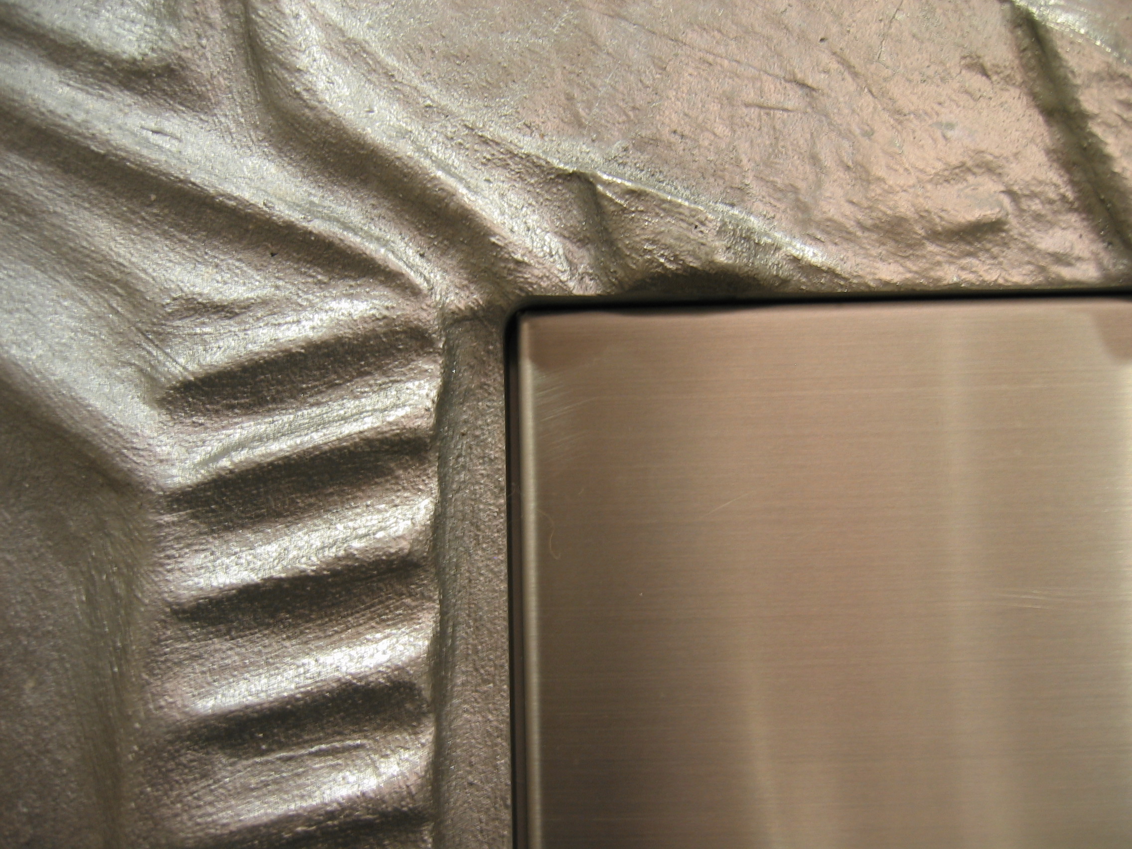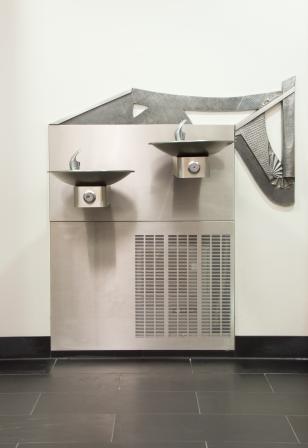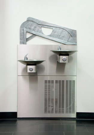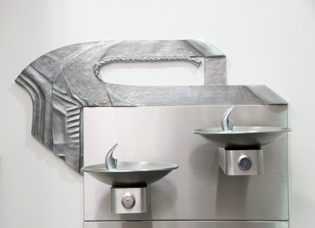 The prospect of creating a permanent work for a public place presented Fecteau with a whole new set of circumstances. He was interested in the liminal places, the places where one would not expect an artwork to be found. He chose to engage the stainless steel drinking fountains between the restrooms on every floor of Byers Hall, creating a series of relief sculptures that incorporated and foregrounded the drinking fountains almost as if they were found objects, partly obscuring the "sculpture." The reliefs are made of aluminum, lost wax castings from Fecteau's papier mâché constructions, and they convey every detail of their fragile originals. Their personal and hand made quality is in stark contrast to the manufactured perfection of the drinking fountains, disrupting and reversing the relationship of sculpture and object, background and foreground.